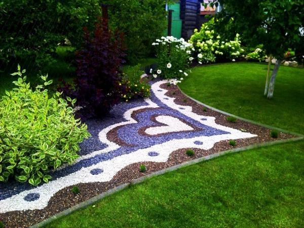 Прежде всего, этот материал применяют для декорирования участков, скрытых в тени, где не будет расти ничего, кроме травы. На таком участке можно создать небольшой искусственный ручеек и красивый мостик. Если участок заболочен, прудик с цветным щебнем на берегу будет выглядеть просто замечательно. А композиция из среднего размера валунов добавит этому искусственному водоему очарования.