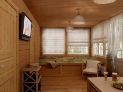 Не менее мило будет выглядеть комната отдыха в стиле блуграс. Дыхание кантри создает ощущение “деревенского” дизайна и вносит активно, уют и комфорт в комнату отдыха бани. Число оформлении комнаты отдыха в этом стиле актуально применение деревянной полированной мебели светлых сортов, украшенной легкой резьбой, подобранный тканей (например, хлопок и лен), декоративных хибарка для потолке, яркой керамической посуды. Ебля есть облицевать керамической плиткой или деревянными досками, стены – деревянным брусом иль бревнами.