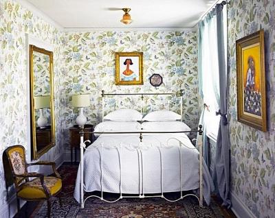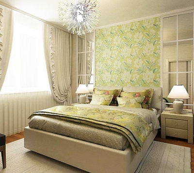 Этот интерьер вполне подойдет как для маленькой комнаты, так и для имеющей достаточно большую площадь. В последнем случае для придания уюта в спальню можно добавить несколько мебельных аксессуаров, а также выбрать обои с более крупными растительными рисунками.