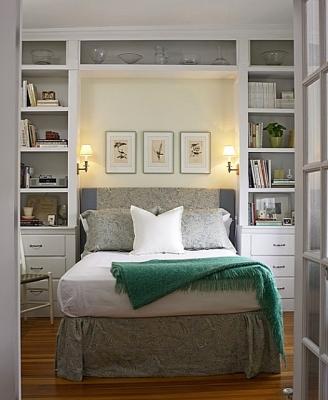 Удачным решением для спальни маленькой площади будут встроенные в стены стационарные предметы мебели — полки, тумбочки и даже шкафы. Удобство состоит в том, что их обустраивают по месту и придают им желаемую форму и размер. А полезная площадь расходуется при этом минимально.