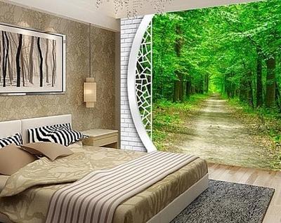 Чтобы визуально увеличить объем комнаты, можно наклеить на одну или две стены 3D-обои, которые создадут эффект расширения пространства. В специализированных магазинах можно найти фотообои на любой вкус — это могут быть цветочные темы, имитация открытого на море окна, тропинки, уходящей в лесную чащу, морские глубины и т.п. Выбирая перспективные обои, необходимо учитывать стиль мебели, которая будет установлена у стены, так как она должна каким-то образом стать продолжением сюжета.