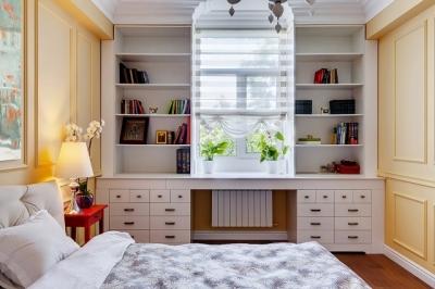Как правило, область вокруг окон и входных дверей в жилых помещениях остается незадействованной. Но когда свободного места явно не хватает, стоит использовать и эти зоны. Причем при правильной планировке можно обустроить не только полки для книг и декоративных аксессуаров, но и рабочее место с тумбочками, оставив радиатор отопления открытым. Правда, от обычных портьер придется отказаться совсем, или же разместить их только в оконном проеме. Другой вариант – шторы заменяются горизонтальными или вертикальными жалюзи. Если площадь спальни позволит, то вокруг двери можно выстроить встроенные шкафы для одежды.