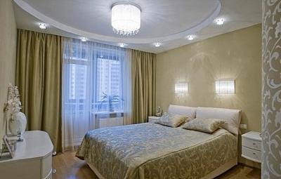 В качестве верхнего освещения может быть использована люстра небольших размеров или точечные встроенные светильники. Большие потолочные электроприборы не подойдут для маленькой спальни, так как они там будут не только неуместны, но еще и визуально сделают потолок ниже. А многие люди себя еще и чувствуют довольно неуютно, когда над кроватью нависает эдакая «громада».