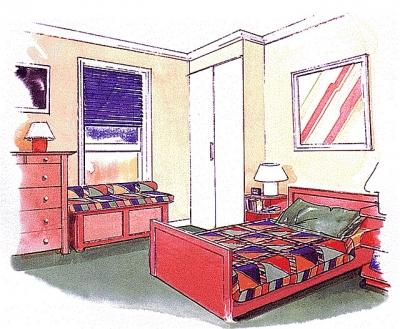 К сожалению, в двухкомнатных квартирах, где всегда испытывается дефицит места, в спальне часто размещают мебель, которой в ней находиться не должно, например, платяной шкаф. Особенно он нежелателен в комнате отдыха людей, предрасположенных к аллергическим реакциям, тем более, если помещение имеет небольшие размеры.