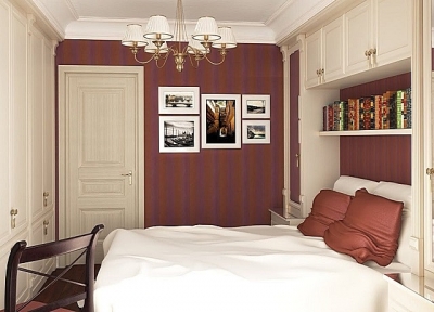 В этом проекте представлена маленькая спальня, оформленная в стиле, который отдаленно напоминает английский. Вернее сказать, в нем использованы элементы, характерные для этого направления — это картины или фотографии в рамках, гармонирующие по цвету и форме с общим оформлением, мебельные предметы, выполненные в определенном стиле, широкие бордюры по периметру потолка и другие мелкие детали интерьера.