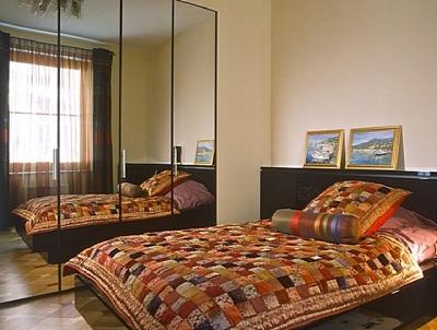 Еще один прием, часто используемый интерьерными дизайнерами — это использование для оформления комнат зеркал. В спальне для зеркал необходимо отвести определенное место, так как нежелательно, чтобы в нем отражались спящие люди. Возможно, это предрассудки, но все-таки если решено сделать зеркальную стену или установить шкаф с зеркальными дверцами, то лучше предусмотреть шторы, которые будут закрывать его на ночь.