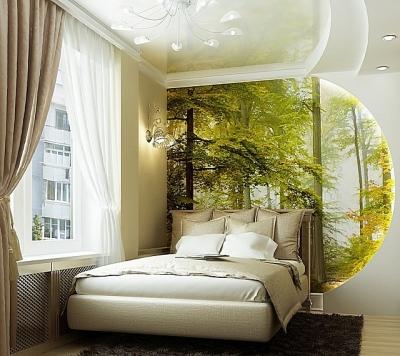 «Пятерка» дизайнеру! – очень удачно совмещены спокойная отделка стен спальни, продуманная подсветка и живописный, расширяющий пространство «лес за окном»