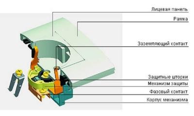 · Лицевая панель выполняет декоративную и защитную функцию. В ней имеется углубление, в которое помещается вилка и отверстия для ее штырей. Лицевую панель изготавливают из негорючего поликарбоната.