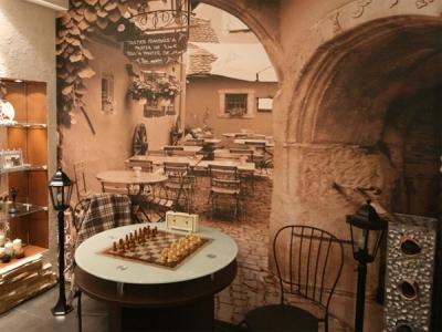 Если фотообоями с изображением столиков в тихом кафе украсить стену у обеденного стола, то помещение удачно «расширится», особенно, когда мебель подобрана такая же, как на картинке.
