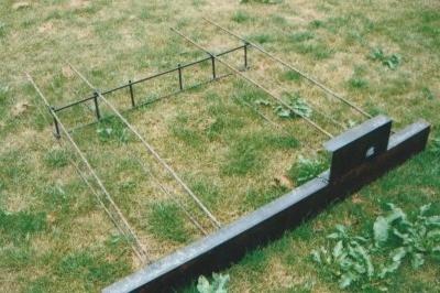 Опускаем каркас в траншею и выставляем строго по уровню. Швеллер должен быть строго вровень с чистовым уровнем пола и горизонтальным. К тому же он должен быть строго параллельным линии забора, вплотную к опорному столбу. Закрепляем каркас надежно от подвижек и готовимся заливать бетон.