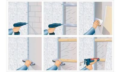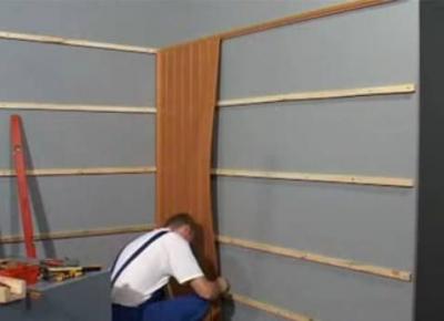 Если для обрешетки используется дерево, все рейки заранее нужно прогрунтовать антисептическим средством. По линиям разметки сверлят перфоратором отверстия под дюбели на расстоянии 50 см, затем прикладывают рейки, ровняют по горизонтали и закрепляют на стене. Там, где стены имеют неровности, под обрешетку укладывают деревянные клинышки. Если по стене идет проводка, ее нужно спрятать под отделкой. Для этого производят замеры, сверлят отверстия в стене и закрепляют провода с помощью хомутов так, чтобы они не выступали за плоскость обрешетки.