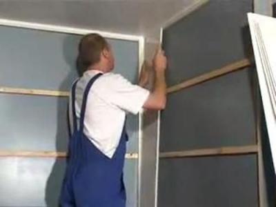 Делают замеры, при необходимости обрезают панель по длине ножовкой. Одним краем панель вставляют в боковой молдинг, прикладывают его к углу и с тыльной стороны крепят его к обрешетке.