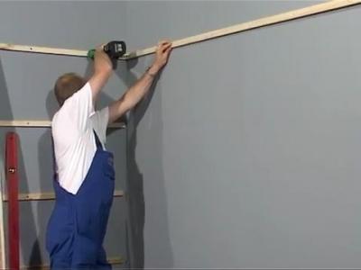 Крепить обрешетку следует строго по уровню, это поможет избежать перекосов. Чтобы не вымерять каждую рейку, следует сделать разметку на стенах. Нижний ряд обрешетки должен располагаться на 1-2 см выше пола, поэтому на стене карандашом отмечают точку на этой высоте, а затем при помощи уровня проводят горизонтальную линию по всему периметру. Точно такую же линию чертят под потолком или по краю отделки, если стены обшиваются не на всю высоту. Далее от нижней линии отмеряют вверх 40-50 см, ставят маячок, и так до самого верха. Через маячки проводят строго параллельные линии по периметру стен. Разметка готова.