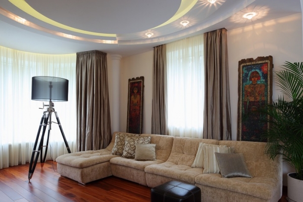 Если вы при ремонте круговой комнаты решили сделать акцент на окнах, ведь реализовать это можно с помощью штор. Во несколько советов: