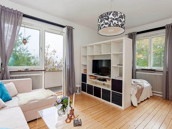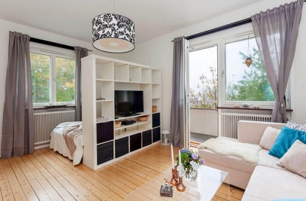 Также зонирования можно добиться с через различных цветов. Спальную зону, например, разрешается затемнить, а гостевую зону или зону отдыха, с хвоста, выделить более ярким цветом. Кроме того, град света позволяет использовать при ремонте круговой комнаты отделочные материалы различных фактур — божий мир подчеркнет каждую, сделает ее заметнее.