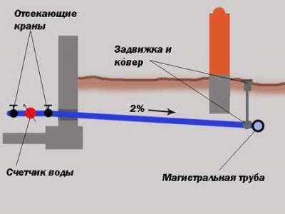 Водопроводные трубы укладываются с незначительным уклоном в направлении источника водоснабжения. Трубопровод должен проходить на 200-250 мм ниже точки промерзания грунта.